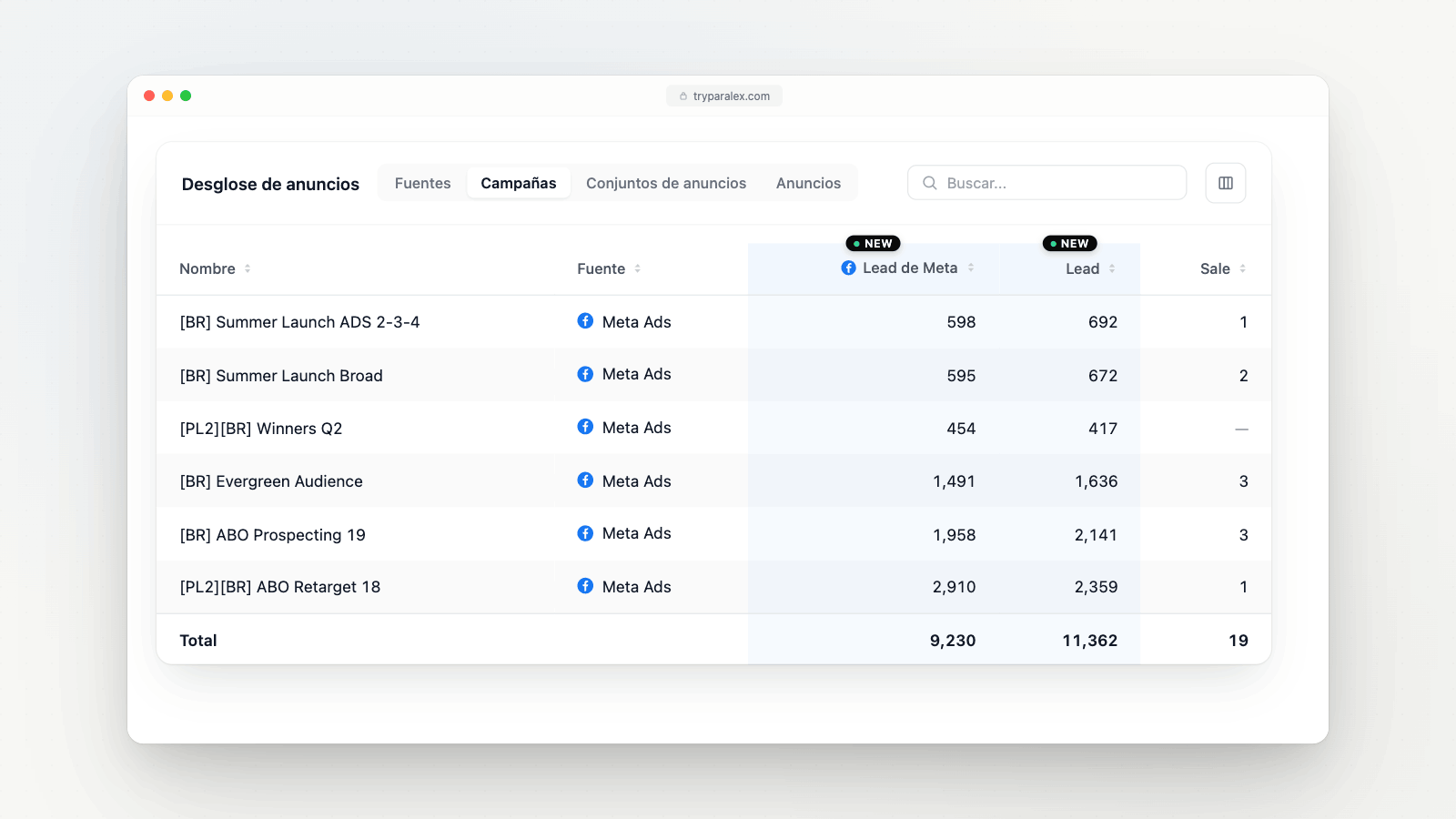 → Si tienes una fuente de leads conectada (AC, GHL, Sheets), la columna de comparación se activa automáticamente.
