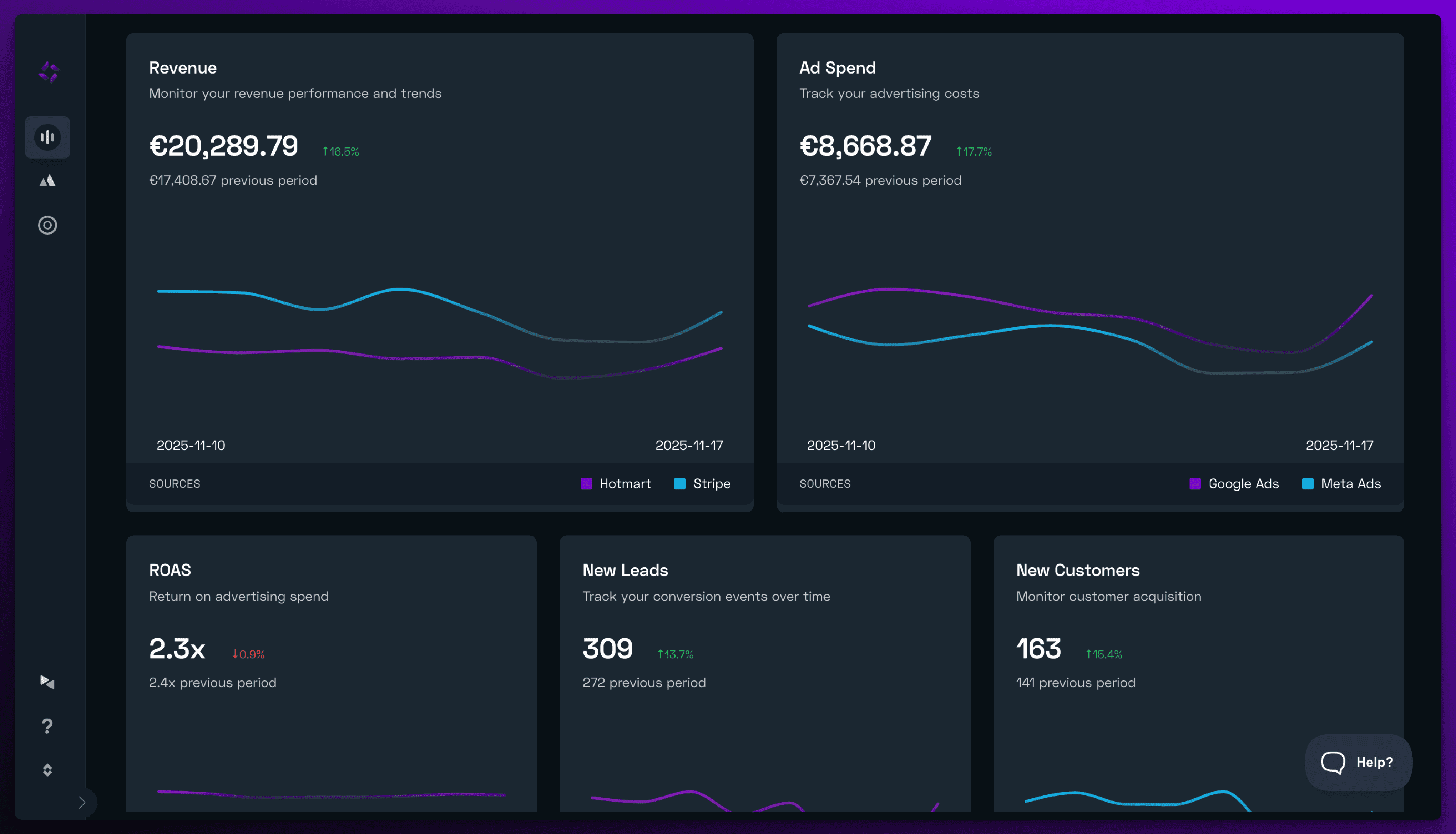 El dashboard unifica datos clave de todas tus integraciones conectadas:
