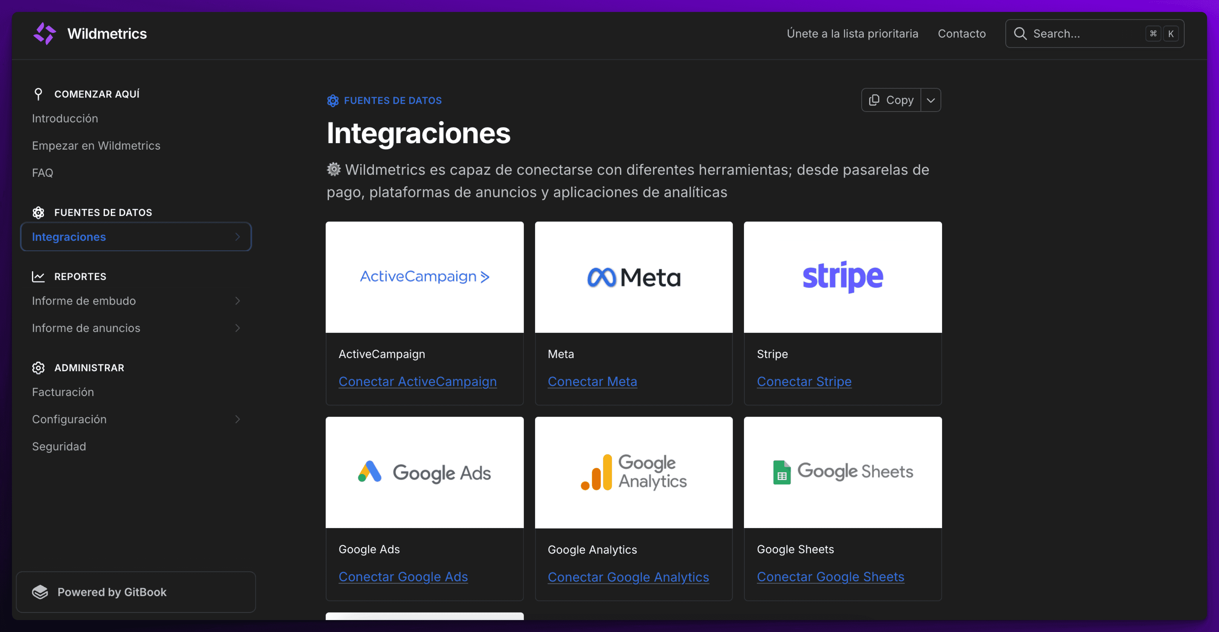 ✅ Asegúrate de tener las claves de acceso y permisos necesarios para conectar cada herramienta a Wildmetrics.