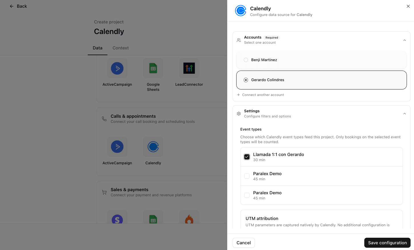Conectas tu cuenta de Calendly y eliges qué calendarios quieres rastrear. Cada tipo de evento se conecta como una fuente de datos independiente (útil si usas un link para discovery calls y otro para demos, por ejemplo).